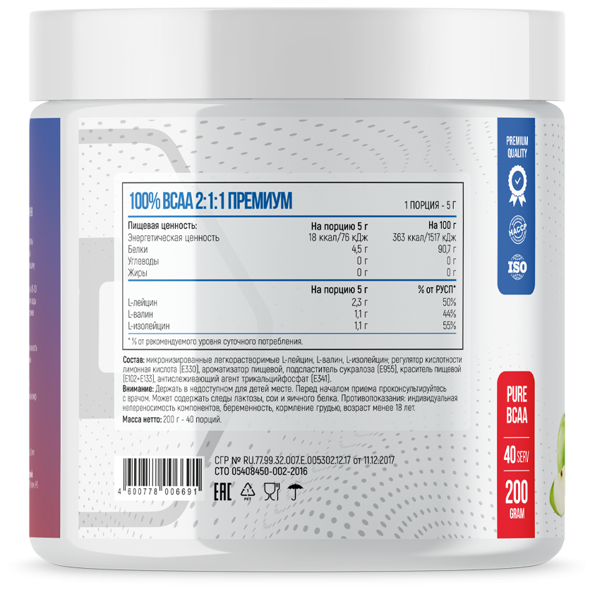 100% BCAA 2:1:1 Premium сочетает в себе сырье премиум качества Instant и технологию семиступенчатой обработки Instantized. Какая вам от этого польза? Эта добавка растворяется и усваивается организмом значительно быстрее в сравнении с аналогами. Более того, на каждую порцию приходится до 91% БЦАА.