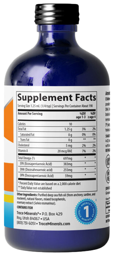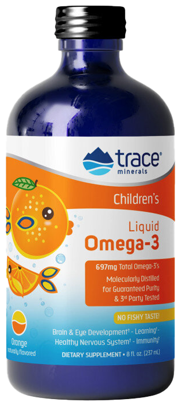 Trace Minerals Children's Liquid Omega-3 - это диетическая добавка, разработанная специально для детей, содержащая омега-3 жирные кислоты. Омега-3 жирные кислоты, такие как эйкозапентаеновая кислота (EPA) и докозагексаеновая кислота (DHA), являются жизненно важными питательными веществами, которые имеют ряд полезных свойств: