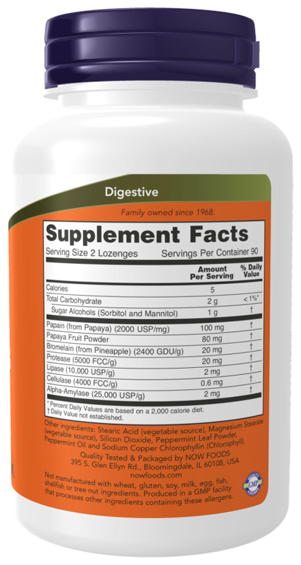 Пищеварительные ферменты необходимы для переваривания и полноценного усвоения пищи организмом. С возрастом способность организма вырабатывать ферменты уменьшается, снижая эффективность пищеварения. Пастилки с ферментами папайи от Now отличаются освежающим вкусом и улучшают пищеварение, если принимать их после еды. Наши пастилки изготовлены из порошка цельной незрелой папайи, подвергнутой распылительной сушке, а каждая пастилка содержит 40 мг папайи. Добавление протеазы, липазы и целлюлазы обеспечивает полный спектр ферментативной активности.