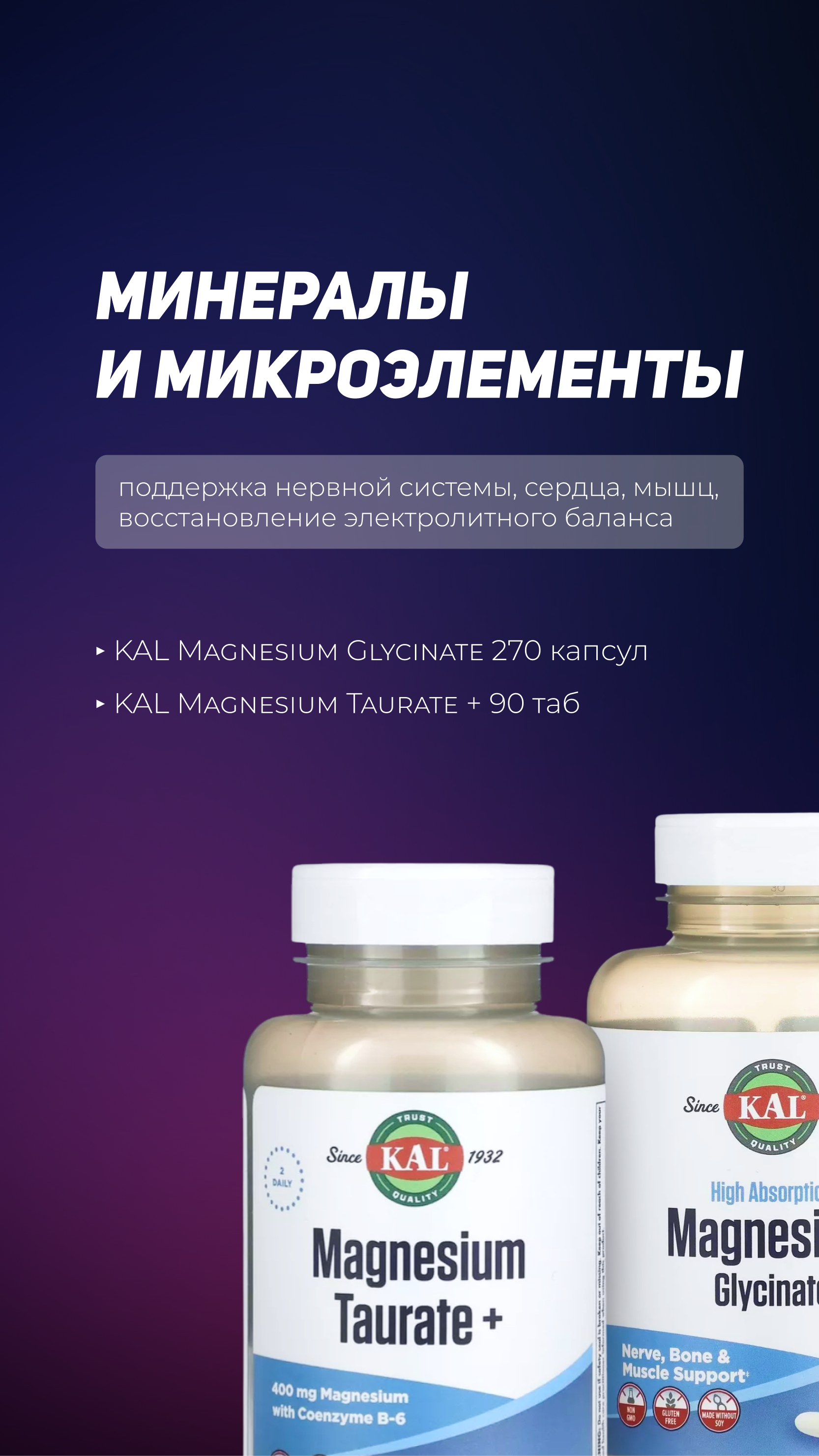KAL Magnesium Glycinate и Taurate: Легкоусвояемые формы магния для поддержки нервной системы, сна, сердца и мышц.