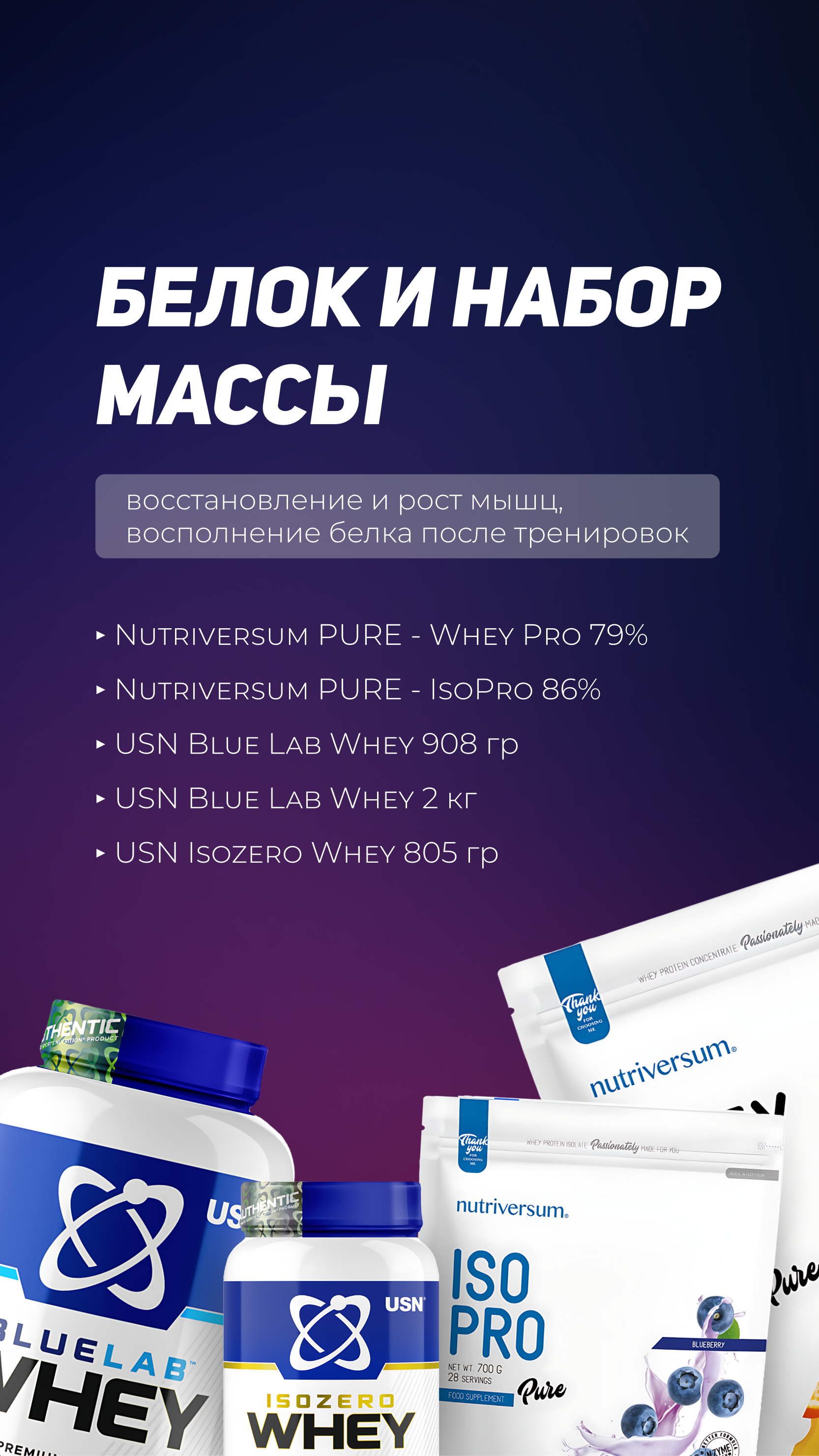 Nutriversum PURE (Whey Pro 79% и IsoPro 86%): Классический сывороточный концентрат и более чистый изолят.